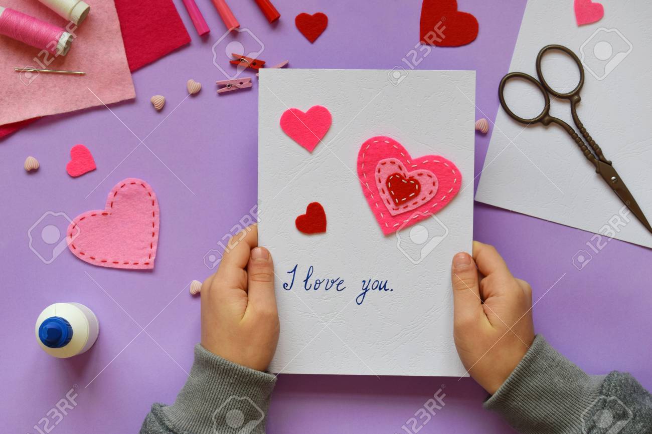 Making Of Handmade Valentine Greeting Card From Felt Children S
