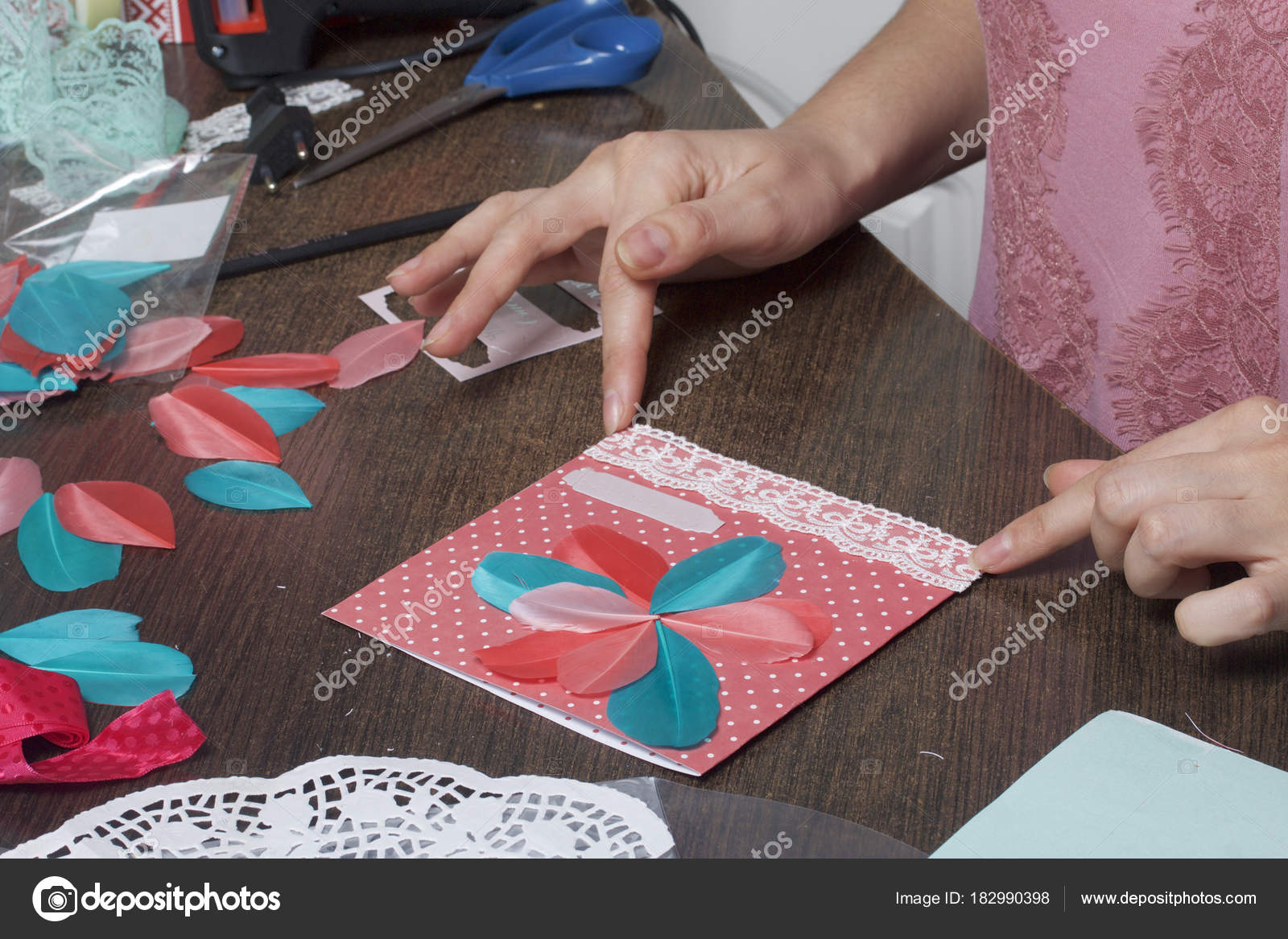 Girl Engaged Making Greeting Cards Home Using Paper Lace Braid